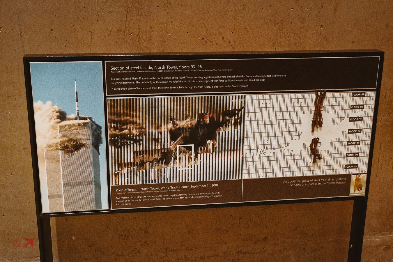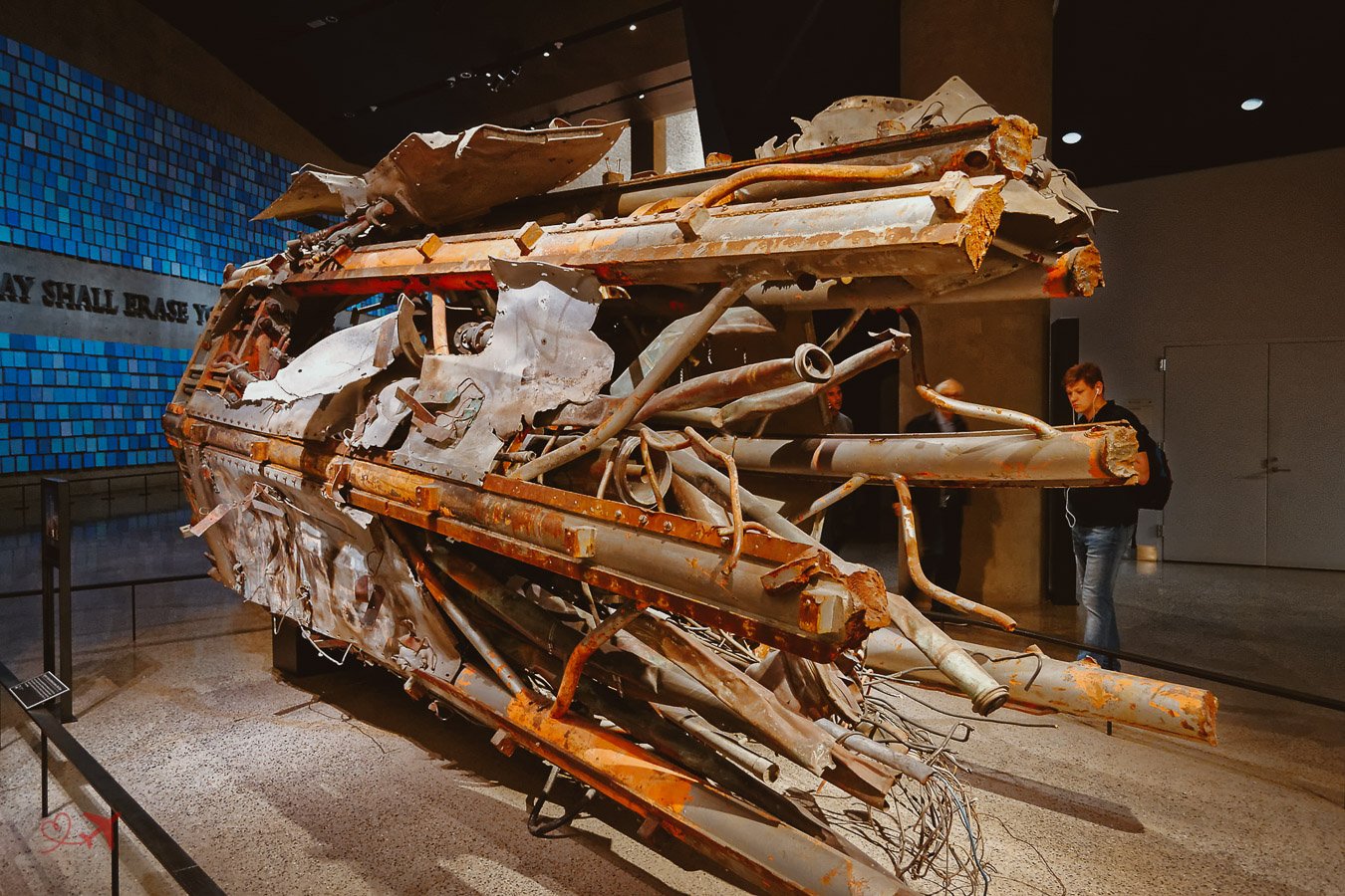 Im Museum findet man beispielsweise zerstörte Einsatzfahrzeuge (einschließlich eines der bekanntesten dem Ladder 3 Feuerwehrfahrzeug), große Metallteile aus allen sieben Gebäuden des World Trade Centers, Aufnahmen von Überlebenden und Ersthelfern (darunter auch mitgeschnittene Telefonanrufe). Fotos aller Opfer, Fotos aus den Trümmern und andere Medien, die die Zerstörung eindringlich beschreiben. Sie zeigen Abstürze, Einstürze, Brände, die Säuberung und weitere teils auch verstörende Fotos, die wir hier nicht beschreiben wollen.