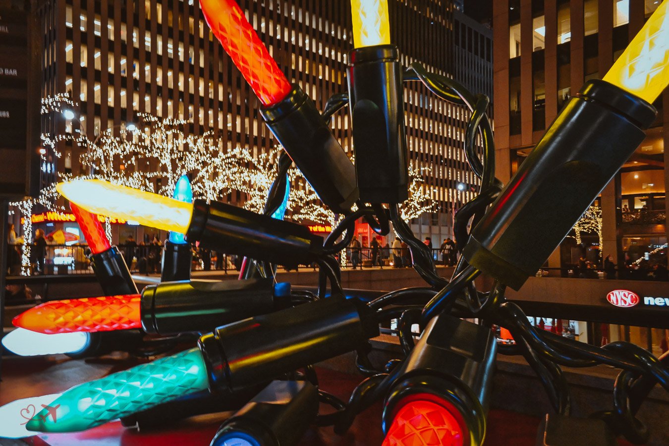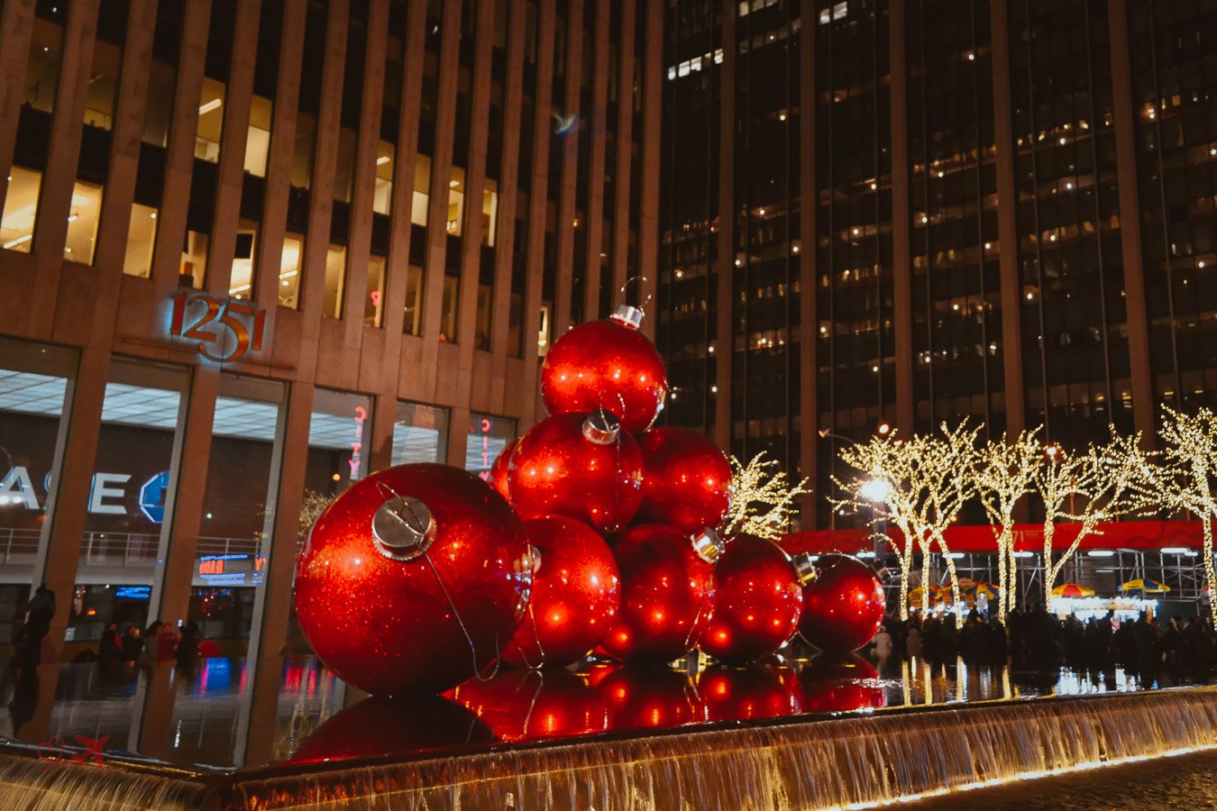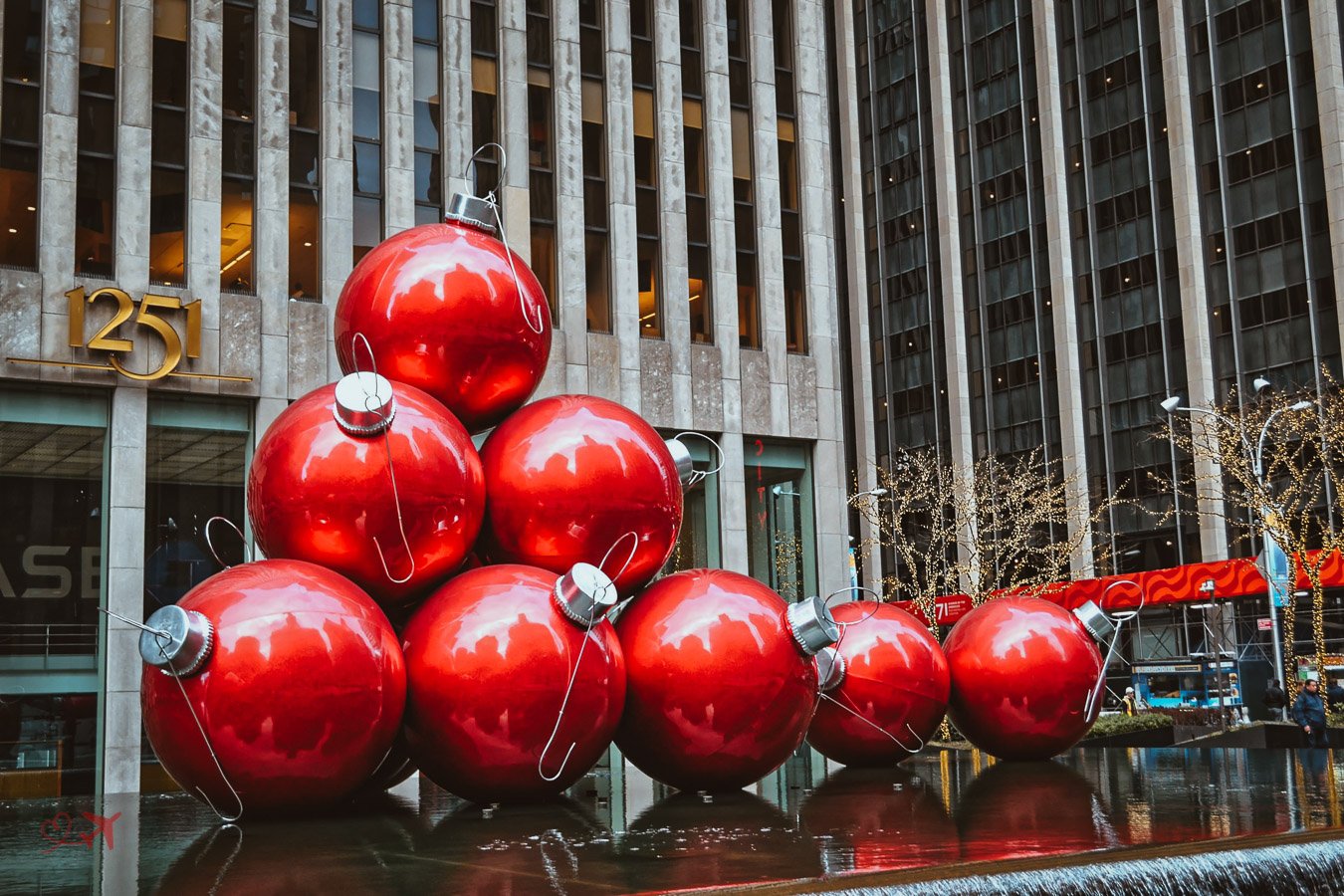 Die großen Kugeln befinden sich auf der Avenue of the Americas (6th Avenue), gegenüber der Radio City Music Hall und sind eines der beliebtesten Motive in der Weihnachtszeit. Auch ein Motiv der besonderen Art ist die übergroße Lichterkette, die auf der gleichen Straße nur einen Block weiter zu sehen ist.