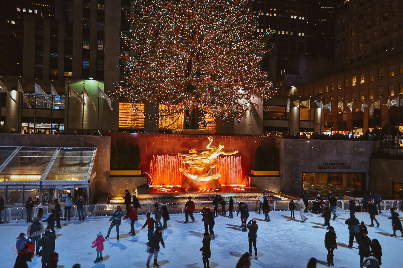 Direkt vor dem Gebäude, im tiefer gelegenen Plaza, befindet sich die wohl berühmteste Eisbahn der Welt. Aber Vorsicht hier müsst Ihr nicht nur einen recht teuren Eintrittspreis berappen, sondern auch die Schlittschuhe dort ausleihen. Eigene zu verwenden ist nicht erlaubt. Der Preis für Eintritt und Leihgebühr liegt, je nach Tageszeit und Auslastung zwischen 60 und 100 Dollar für 1 Stunde.