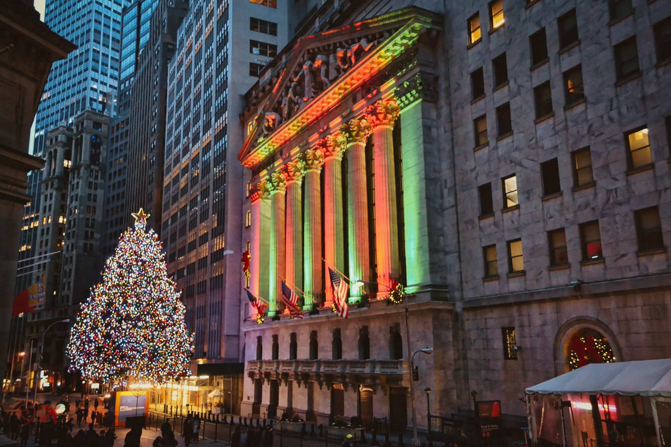 Einer der schönsten Bäume steht mitten in der Wall Street neben der New York Stock Exchange, eines meiner Lieblingsfotos, das ich auch in geschnittener Form in jedem Jahr auf meinem Handy habe. Ich mag die Stimmung des Bildes, zum einen der Weihnachtsbaum und zum anderen die grün/rot beleuchtete Fassade.