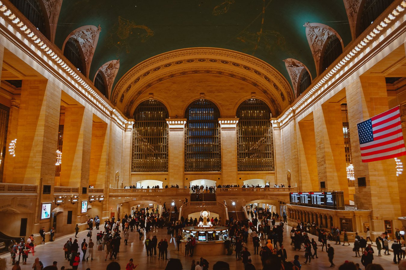 Der am 09. Februar 1913 eröffnete Bahnhof ist ein wahres Schmuckstück der Architektur. Vor allem die grüne Decke mit den Sternbildern ist ein wahrer Augenschmaus für jeden Fotografen. Ein Foto von der Treppe in die Haupthalle ist eines der bekanntesten und beliebtesten Motive in New York City. Noch berühmter ist der Info-Kiosk in der Mitte der Haupthalle. Das Motiv hier ist natürlich die von 4 Seiten einsehbare Uhr. Ein besserer Platz für den Kiosk kann es kaum geben!