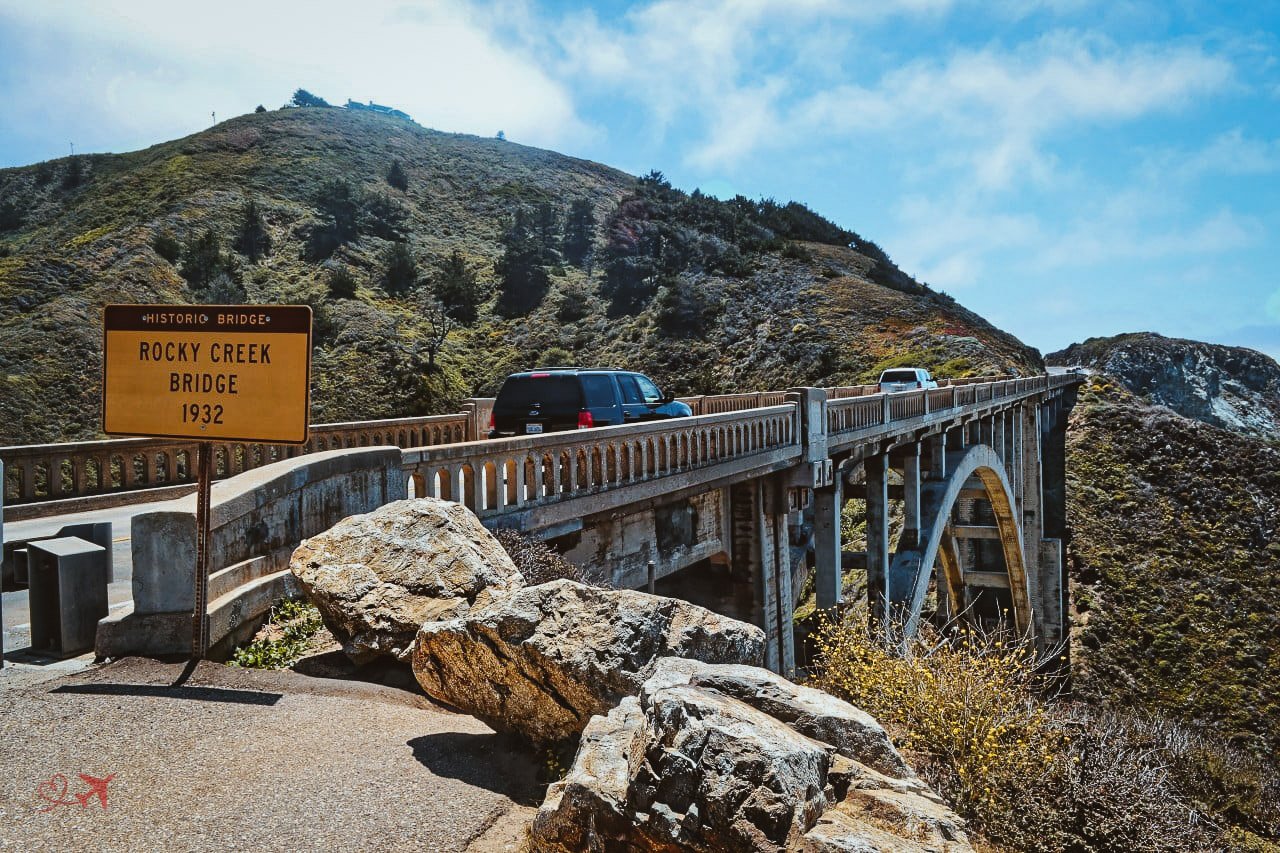 Nach 20 Kilometern kamen wir zur ersten Brücke über die vielen Creeks, die Rocky Creek Bridge. Die Stahlbeton-Bogenbrücke im Art déco Stil überspannt den Rocky Creek und wurde 1932 als eine der ersten Brücken des Highway 1 im “Big Sur” für den Verkehr freigegeben.