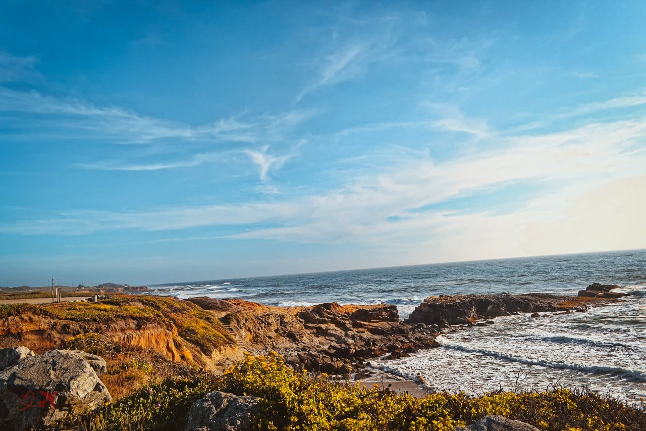 Weiter geht es direkt am Pazifik entlang, vorbei an den malerischen Steilklippen und zu einem Strand, dessen Eingang zunächst recht versteckt war. Den Gray Whale Cove State Beach hatten wir an diesem späten Nachmittag ganz für uns alleine, was wir natürlich sofort auskosteten.
