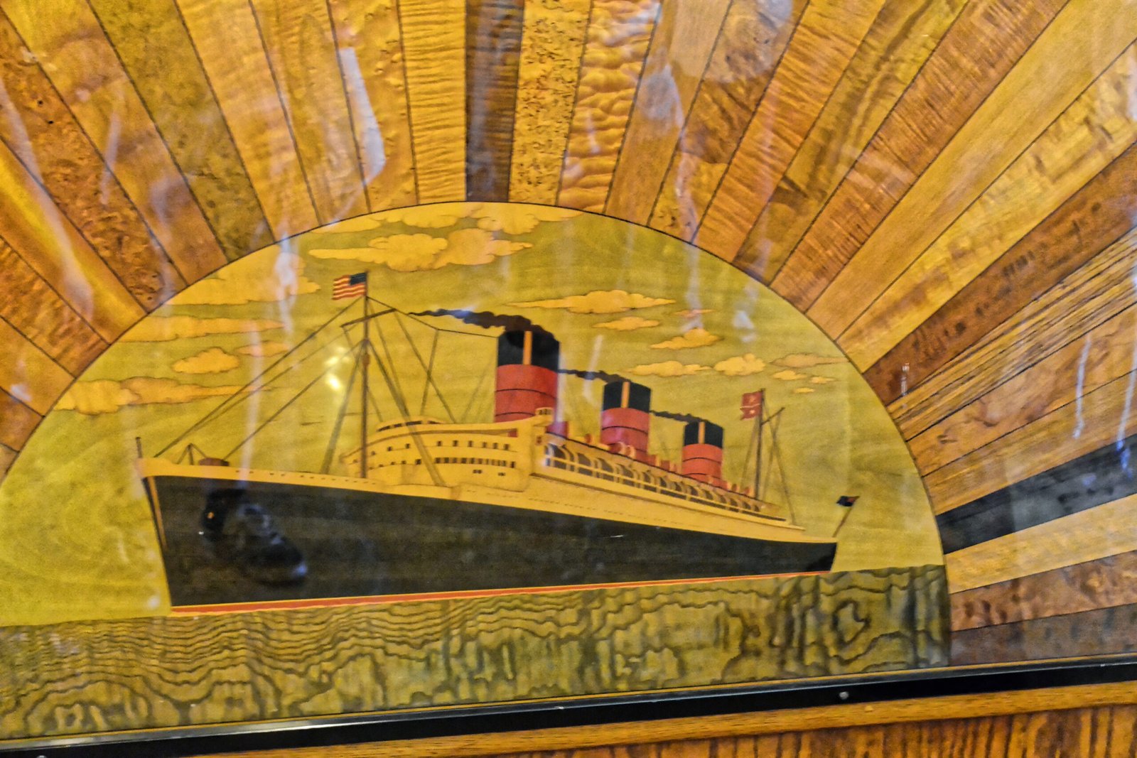 Ein Foto in der Galerie zeigt ein Bild des Schiffs, das nicht(!) gemalt ist. Es besteht aus verschieden eingefärbten, verleimten Hölzern. Ein echtes Meisterstück!