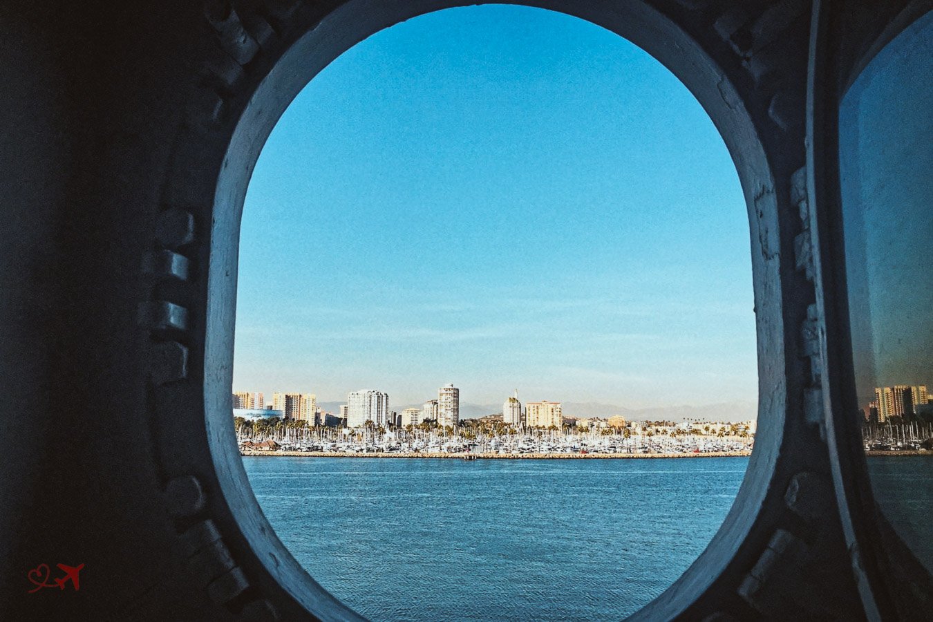 Das Foto aus dem Bullauge zeigt den wirklich traumhaften Ausblick aus den Kabinen auf die Skyline und den Strand von Long Beach. 🤩