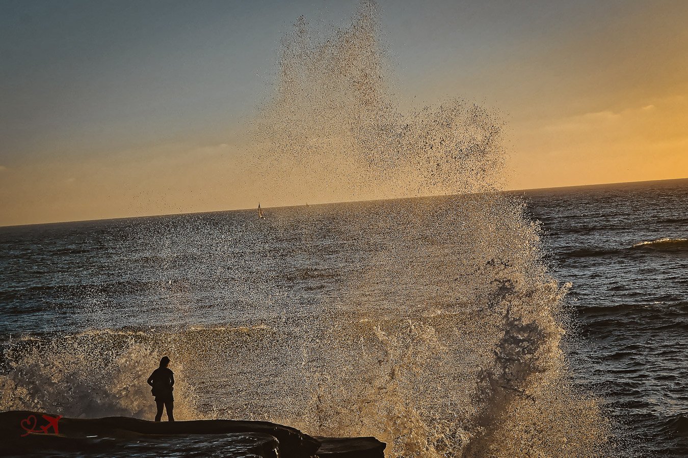 Steht man in der Nähe der Klippenkante, kann es gut sein, dass man nass wird. Die hohen Wellen am Abend schießen bis über die Klippen, wirklich atemberaubend schön.