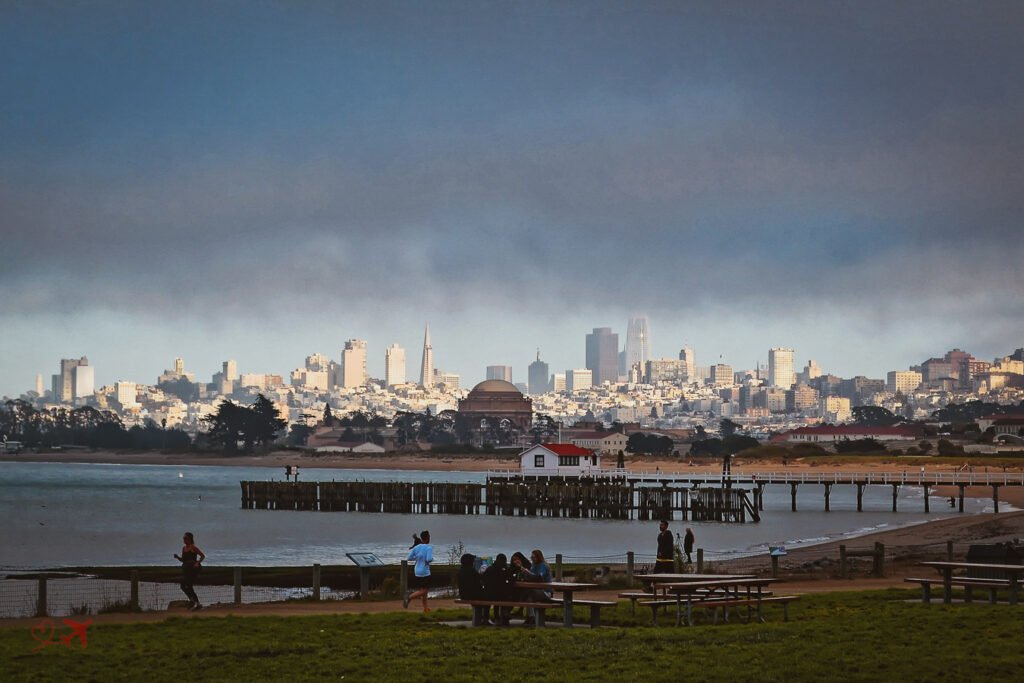Stehst Du am Strand, liegt auf der linken Seite die Golden Gate Bridge und auf der rechten Seite die Skyline von San Francisco.