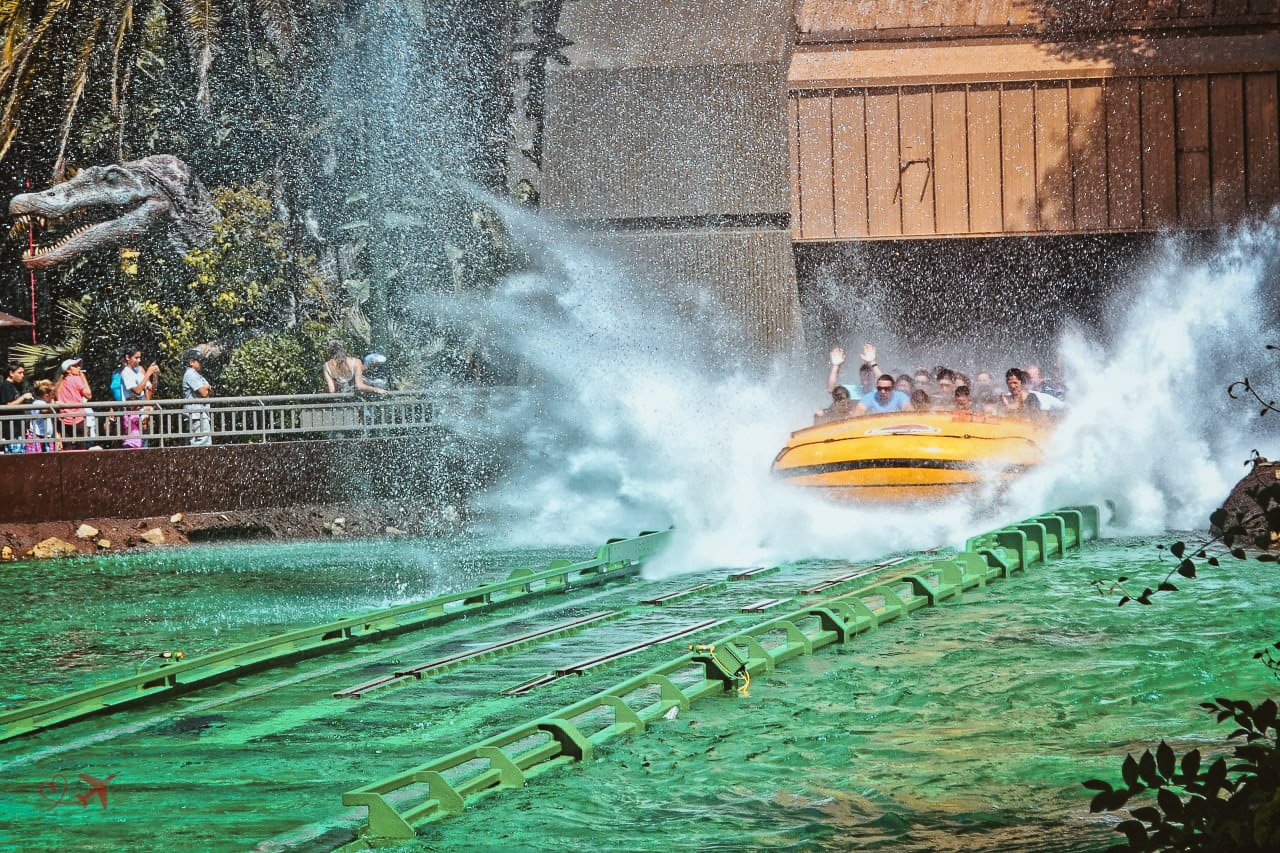 Für uns gab es ein besonderes Highlight, das wir selbst mehrmals an diesem Tag brauchten – Abkühlung. Die gab es in der Attraktion “Jurassic World”. Mit großen Booten geht es durch die Junglewelt, vorbei an riesigen Dinosauriern in einen Tunell.