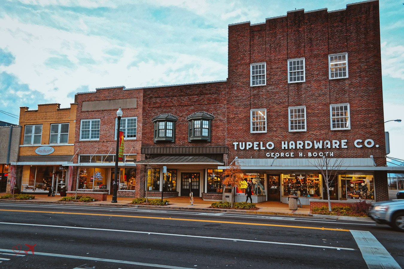 Beginnen wir im Stadtzentrum des kleinen Städtchen im Bundesstaat Mississippi. Hier steht das historische Gebäude von Tupelo Hardware Co. in dem Elvis als kleiner Junge von Gladys Presley (seiner Mutter) seine allererste Gitarre (für $ 7.75 – für damalige Zeiten ein teures Geschenk) geschenkt bekam, es war der 08. Januar 1946, sein 11. Geburtstag.