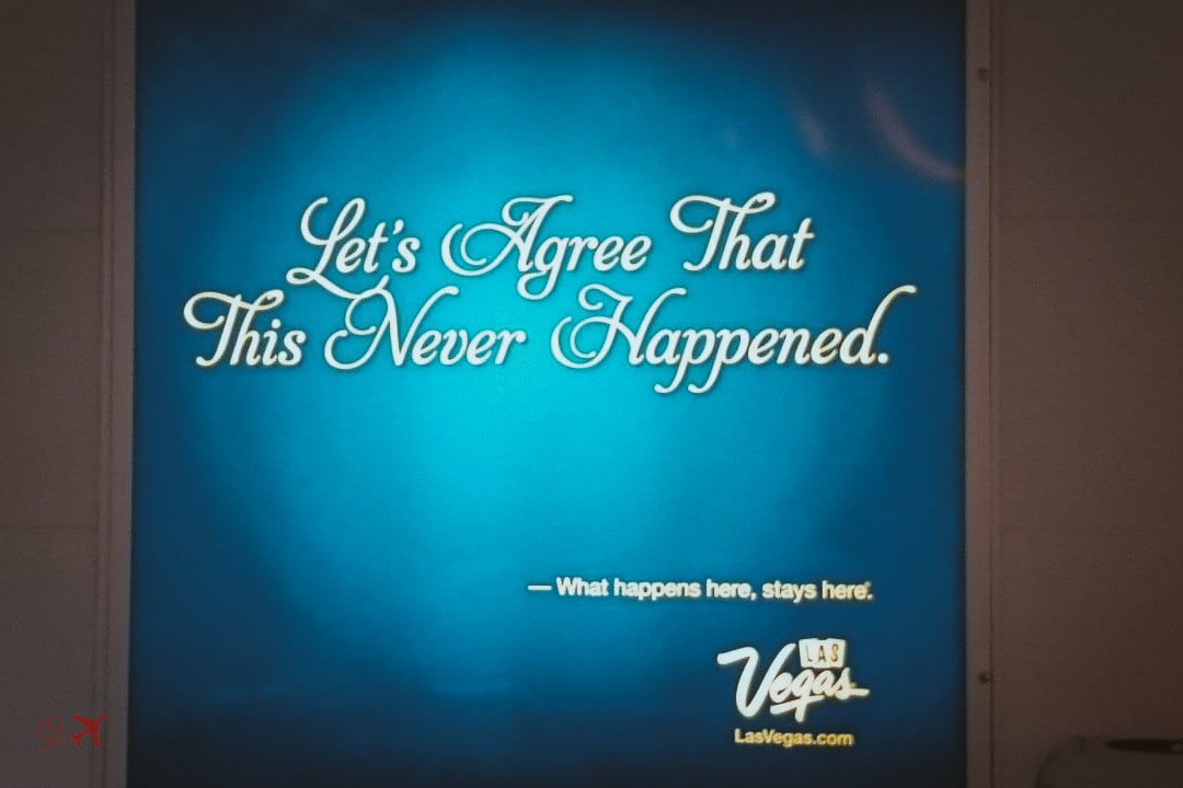 Auf dem Flughafen von Las Vegas findet Ihr kurz vor dem Abflug noch ein Schild mit dem Spruch “Let’s Agree That This Never Happened. – What happens here, stays here.”
