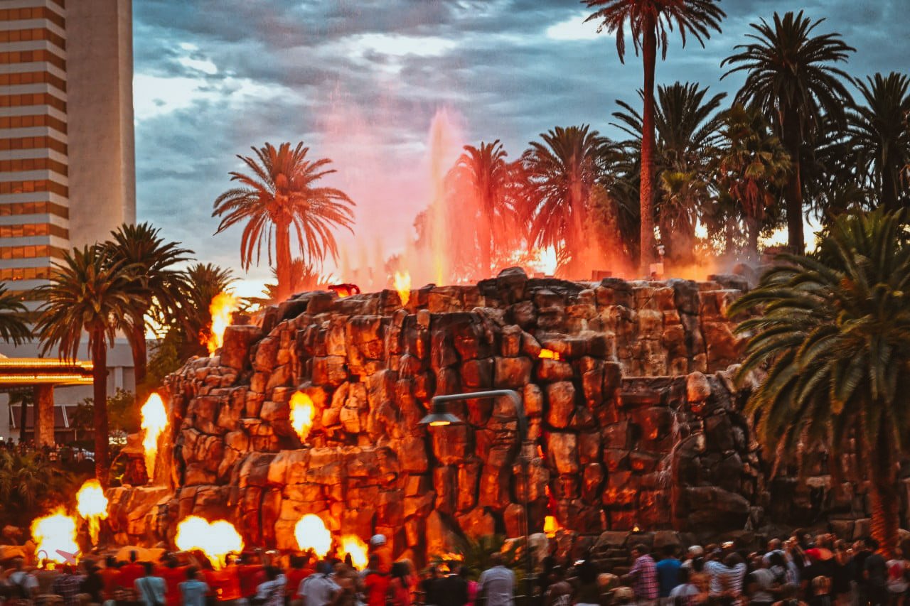 Der Bus setzte sich in Bewegung und fuhr zunächst über den Strip zum berühmten Las Vegas Schild. Dort machten wir dann einen Foto-Stopp mit der Möglichkeit selbst Fotos zu machen, oder kostenlos fotografiert zu werden. Als wir auf dem Rückweg dann am Mirage ankamen, startete dort gerade der Vulkanausbruch. Der Busfahrer machte extra sehr langsam, damit wir noch das meiste mitbekommen konnten. Dies war natürlich begleitet von Hupkonzerten der Autofahrer hinter uns 😉